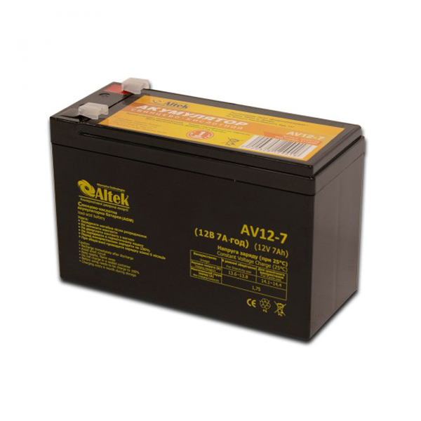 Аккумулятор Altek AV12-7 AGM — надежная свинцово-кислотная батарея с герметичным корпусом. Применяется для электроснабжения частных домов и небольших коммерческих объектов при плановых отключениях или авариях в сети. В батареях серии AGM кислота абсорбируется стекловолоконными матами. Эта технология предупреждает сульфатацию и оседание электролита, что значительно продляет жизненный ресурс АКБ.
